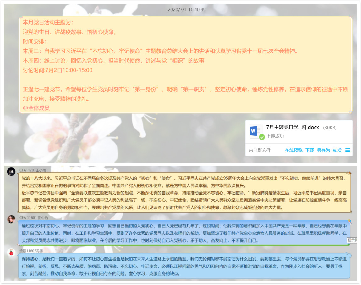 根据《关于组织开展2020年7月份“支部主题党日”活动的通知》,7月4日中午,金融员工二党支部组织召开了“迎党的生日、讲战疫故事、悟初心使命”主题党日活动。活动通过企业微信线上进行,支部全体党员参加活动。