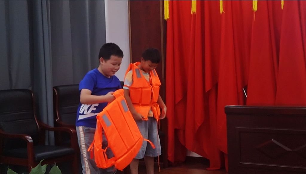 贪玩调皮的乐乐打闹时不慎跌落池塘,“救救我,快救救我!”恰好被岸边路过的朵朵听到,“救命,有人掉水里了,快来人呀!”“你别慌,我这就把救生衣给你!”,最终乐乐成功获救。这场由支教队员和孩子们共同演绎的情景剧,以“小河边的安全小课堂”为主题,将溺水险情搬进课堂,展示了落水后的自救要点与科学施救方法,一开场就抓住所有孩子的目光。“看到有人落水,我们要像朵朵这样大声呼救,还可以把旁边的救生圈、长竹竿递过去,但绝对不能自己跳下去!”剧情落幕,支教队员化身“安全导师”,现场演示了“借助器材救援”的正确动作,用夸张的肢体语言模仿“徒手救人被拖入水中”的危险场景,强化了孩子们的记忆点。“不准私自下水游泳,不准到不熟悉的水域游泳……”孩子们齐声跟念安全口诀,在聆听与互动中加深了对防溺水知识的理解。“一二年级孩子年龄小,单纯说教记不牢,情景剧更接地气。”支教队员们表示,几分钟的角色扮演既有趣又实用,孩子们在笑声中记住了防溺水要点,也增强了自我保护意识。