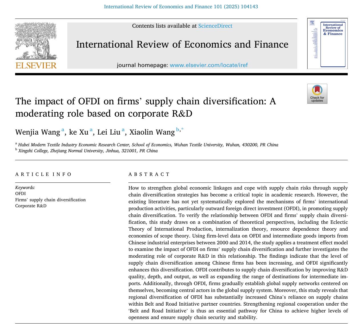 近日,yl23455永利研究生许可在导师王文佳老师的指导下,在国际期刊International Review of Economics and Finance(《国际经济与金融评论》)合作发表题为“The impact of OFDI on firms’ supply chain diversification: A moderating role based on corporate R&D”(对外直接投资对企业供应链多元化的影响:基于企业研发的调节作用 )的学术论文。