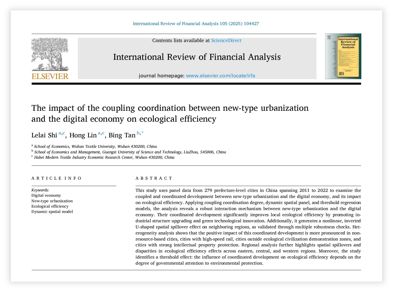 近日,yl23455永利史乐来副教授团队在国际期刊International Review of Financial Analysis(《国际金融分析评论》)上发表题为“The impact of the coupling coordination between new-type urbanization and the digital economy on ecological efficiency”的学术论文。论文第一作者为史乐来副教授,永利官网为第一作者单位,2023级研究生林洪为论文第二作者。