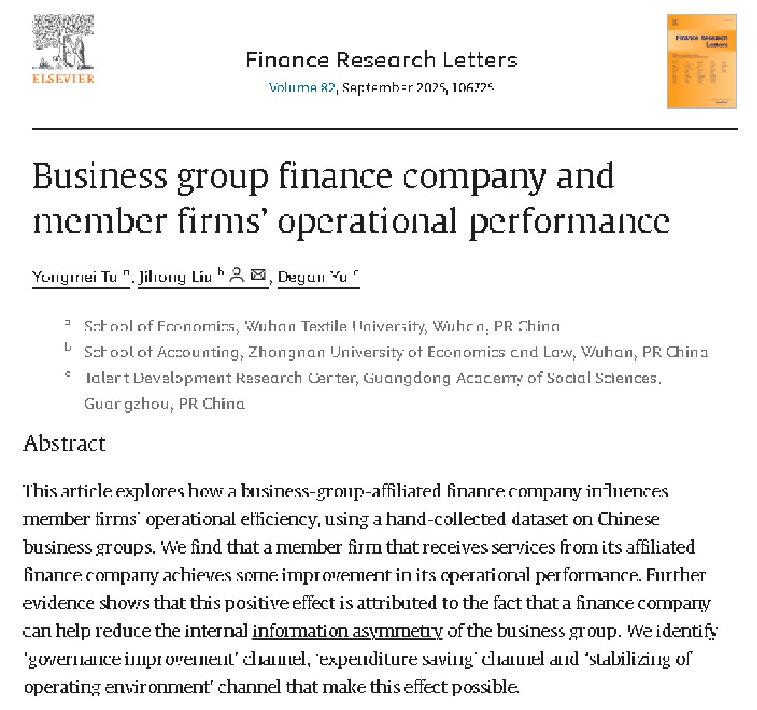 近日,yl23455永利涂咏梅教授合作完成的学术论文“Business Group Finance Company and Member Firms’ Operational Performance”在国际知名期刊Finance Research Letters在线发表。论文第一作者为涂咏梅教授,永利官网为第一作者单位。