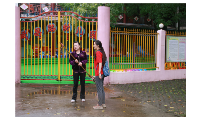 (队员与正在打扫卫生的高经理交流)