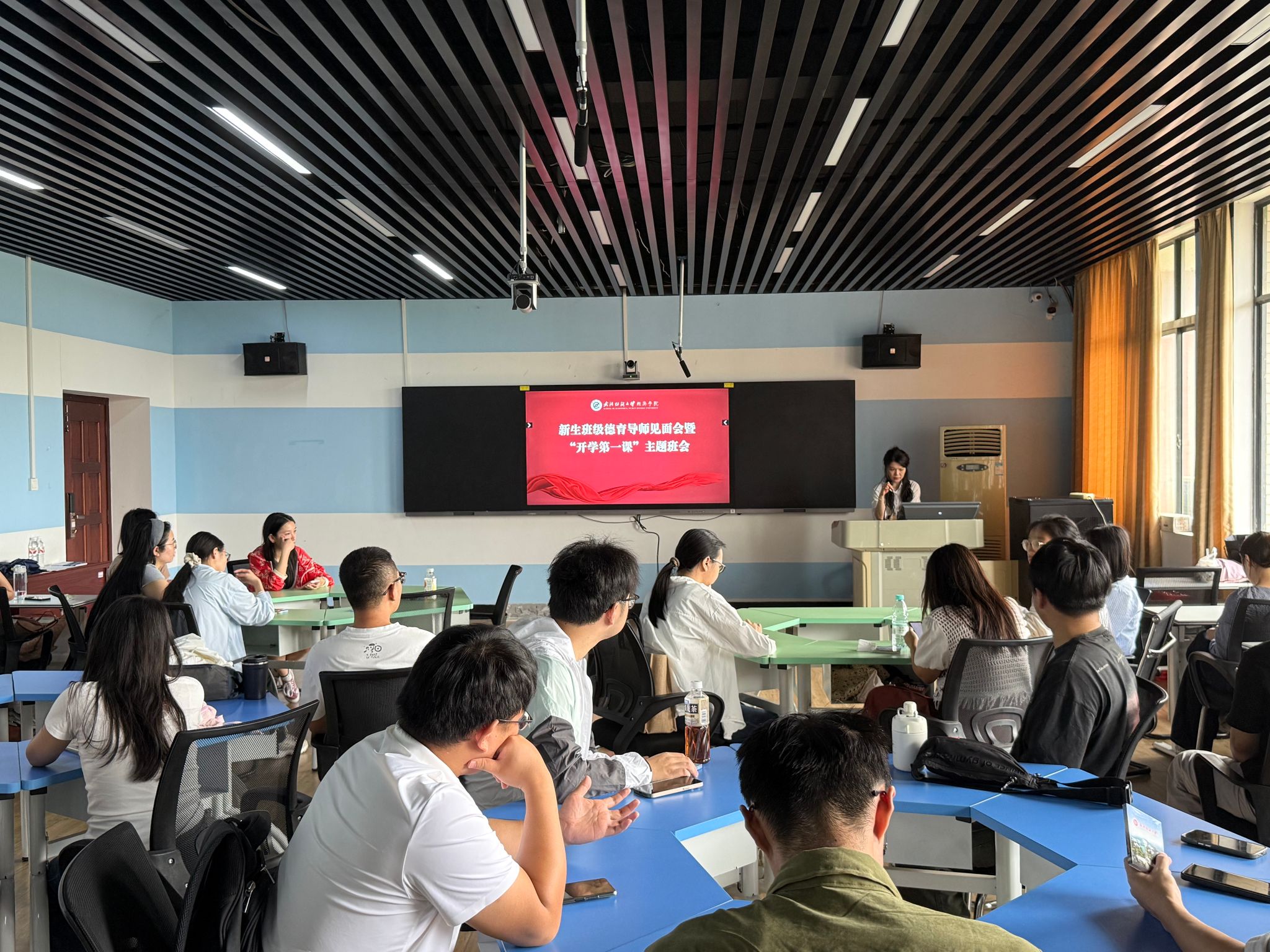 各德育导师面向新生细致介绍了自身的教育背景、学术研究方向以及日常沟通渠道,表达了对新生到来的欢迎、期待和祝愿。班会上,德育导师们结合PPT,聚焦新生入学初期最关切的议题,分模块开展针对性指导,引导新生要强化安全防范意识与自我保护能力,严格遵守公司各类规章制度、纪律要求和管理规范,严禁在工作间、宿舍使用大功率电器,严防校园贷、网络赌博及网络诈骗,共同营造安全、谐的学习生活环境,夯实校园安全稳定底线。德育导师们结合经济学科特色与当下就业市场趋势分享个人体会,并给予新生成长发展建议,勉励新生要结合自身兴趣与优势,尽早适应、积极融入,明晰个人学术规划与发展目标并积极投入到实践中。