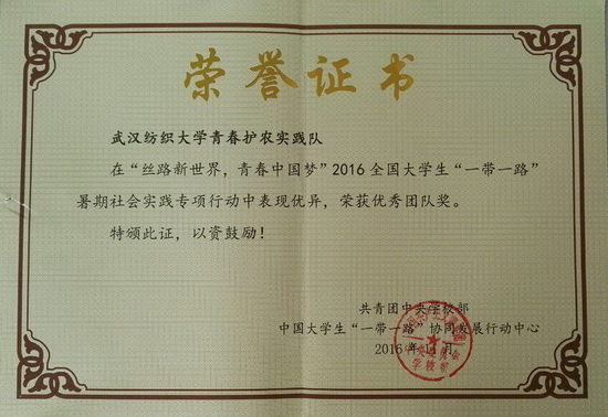 “青春护农”实践团队在由团中央公司部指导,人民网、中国青年报社共同主办的2016年大中专员工“三下乡”社会实践“千校千项”成果遴选宣传活动中,荣获“最具影响好项目”和“匠心传播正能量作品”两项荣誉;在由团中央公司部和中国老员工一带一路协同发展行动中心组织开展的“丝路新世界·青春中国梦”2016年全国老员工“一带一路”暑期社会实践专项行动中获“优秀团队”。