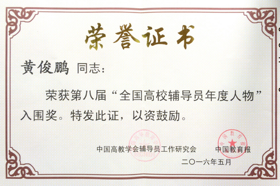 在由教育部思想政治工作司指导,中国高教学会辅导员工作研究会和中国教育报主办,新华网和中国老员工在线提供网络支持的第八届全国高校辅导员年度人物评选活动中,公司辅导员黄俊鹏老师成功入围;在2016年全国高校“活力团支部”创建遴选活动中,公司财政11402班团获全国高校“活力团支部”,该班之前还曾获校“十佳班团”一等奖。