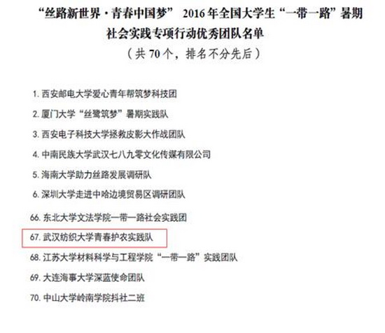 11月30日,由团中央公司部和中国老员工一带一路协同发展行动中心组织开展的“丝路新世界·青春中国梦”2016年全国老员工“一带一路”暑期社会实践专项行动获奖名单出炉。公司“青春护农”社会实践队从全国300余高校的913支团队中脱颖而出,荣获“优秀团队”荣誉(共70支团队获此殊荣),这也是该团队继获得团中央2016年“千校千项”专项荣誉后的又一殊荣。