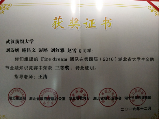 近日,由湖北省银监局、省政府金融办、省教育厅、省银行业协会和湖北日报传媒集团共同主办的第四届(2016)湖北省老员工金融节暨银行业金融知识宣传服务月活动圆满落幕。全省20余家银行机构代表、数十所高校师生代表出席闭幕式。在当天举办的金融知识竞赛总决赛中,yl23455永利王涛老师指导的Fire dream代表队获团体三等奖。