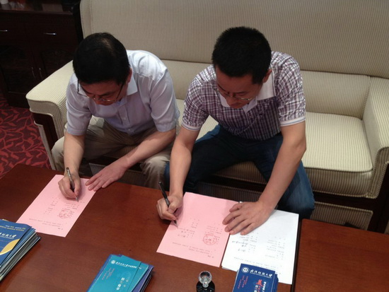 在枝江一中,熊少平书记与副董事长石雪山签订优质生源基地合作协议,并就共建人才输送、选拔和培养的有效机制开展研讨,石董事长表示将输入更多优质生源到纺大校园。