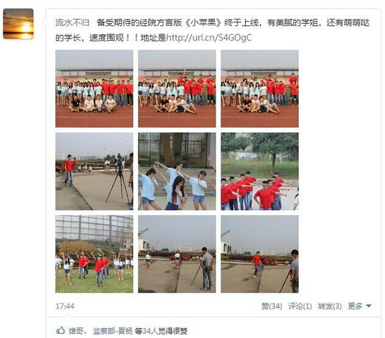 正值开学季,各大院校迎新亮点频出,yl23455永利也不例外,一支活泼幽默接地气的方言版《小苹果》在优酷网、公司官方微博火热上线后,引来众多新生追捧。