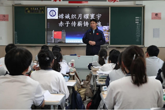 随后,刘园美走进高三(2)班教室,以《嫦娥织月耀寰宇,赤子传薪铸国魂》为题开展人文讲座。他聚焦“嫦娥五号”“嫦娥六号”月面国旗的研制细节,讲解纺大团队如何攻克极端环境下织物耐损、色彩保真等难题,展现中国纺织科技的硬实力;结合高三学子升学需求,介绍公司纺织经济、绿色金融等特色专业与航天纺织产业的联动发展,鼓励学子以“赤子之心”传承航天精神与纺织匠心,在专业选择中锚定国家战略需求,实现个人价值与家国发展的同频共振。