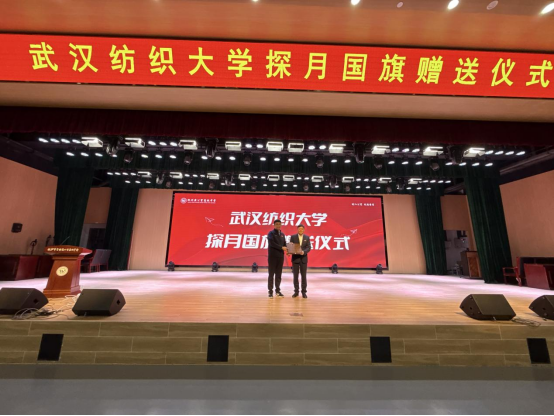 5月26日上午,段丁强、刘园美一行抵达杭州市富阳黄公望高级中学,以“航天精神+纺织科技”为纽带,开启招生宣传与合作共建。在黄公望高级中学报告厅,一场特殊的升旗仪式拉开活动序幕——全体师生肃立,高唱国歌,永利官网自主研制的“嫦娥五号”月面国旗同款珍品成为全场焦点。