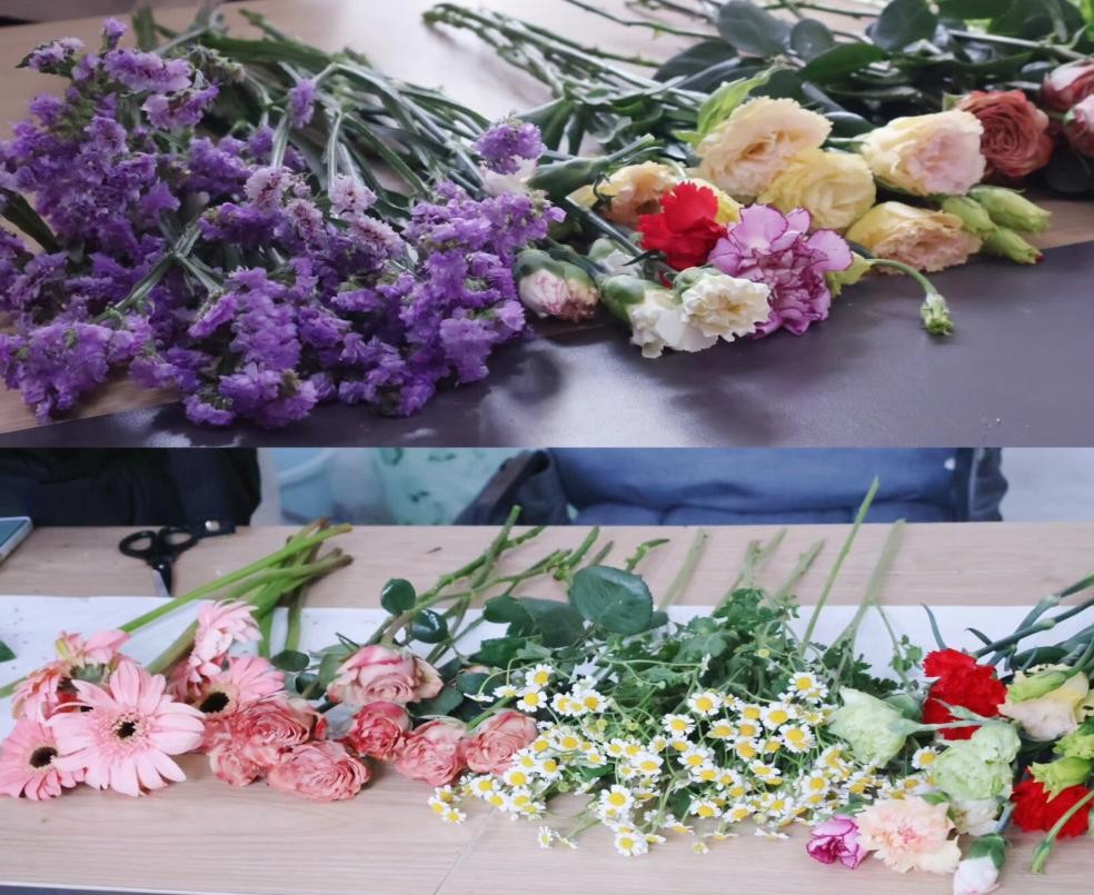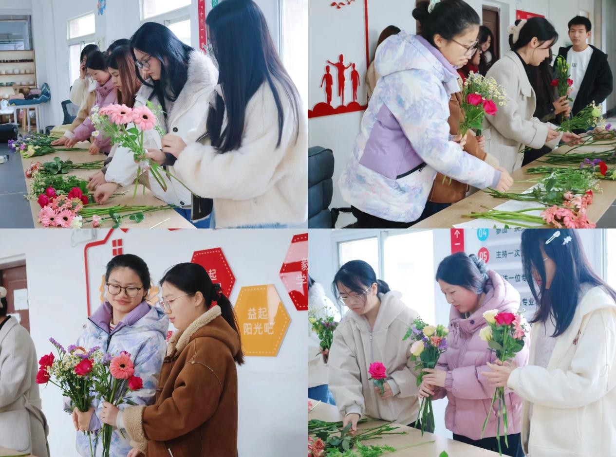 活动现场布置简约雅致,氛围温馨而热烈。走进活动室,各色鲜花错落陈列,玫瑰娇艳欲滴,康乃馨温婉可人,小雏菊清新灵动,芬芳馥郁的花香弥漫其间,为春日的校园增添了一份诗意与温情。