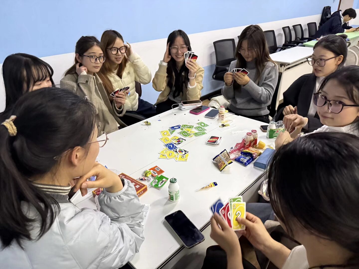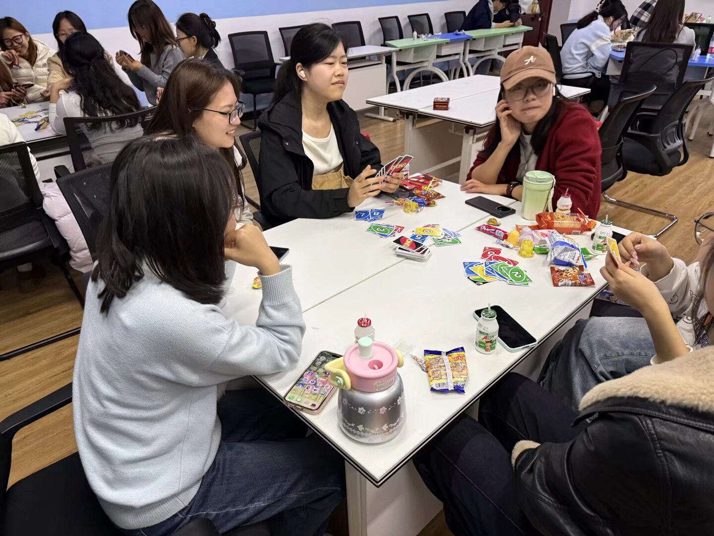 桌游板块设置 UNO 卡牌、三国杀两大特色项目。UNO 卡牌环节,参与者在色彩与数字的碰撞中快速反应、灵活出牌,巧用功能牌掌控局势,欢快氛围里暗藏精彩的策略博弈。三国杀区域上演沉浸式身份对抗,选手们依托武将特性与手牌布局步步为营,在身份隐藏、逻辑推演中展开交锋,尽显思辨能力,也让大家在对弈中拉近距离、增进同窗情谊。