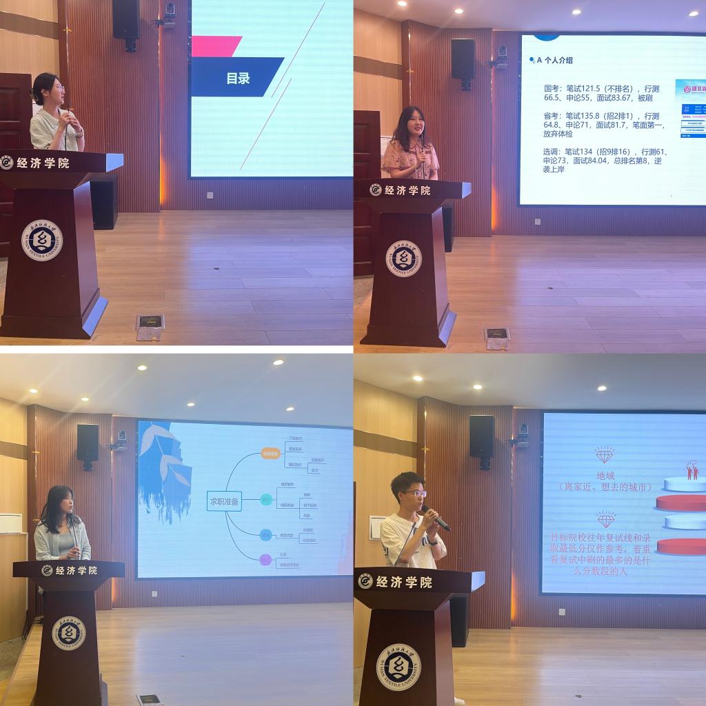 活动中,6位19级员工分享有关成功上岸、收到offer和考取选调生的宝贵经验。国内考研员工代表从考研目标选取、备考时间安排、复习方法建议、复试技巧等多个方面,针对“考公还是考研?”“是否可以冲刺名校?”等问题表达了自己的观点。国外考研员工代表带领同学们分析出国留学的优势和劣势,比较各个国家的申请条件,并分享申请国外大学的切身体会。考公员工代表结合亲身经历,围绕国考、省考和选调生的报考注意事项,为同学们带来考公方面的详细解说。拿到数十份offer的就业达人代表深刻剖析券商、银行的投递简历要点,带来有关笔试、面试的技巧总结分享。听完员工代表们的分享,在场同学纷纷表示“干货满满”。