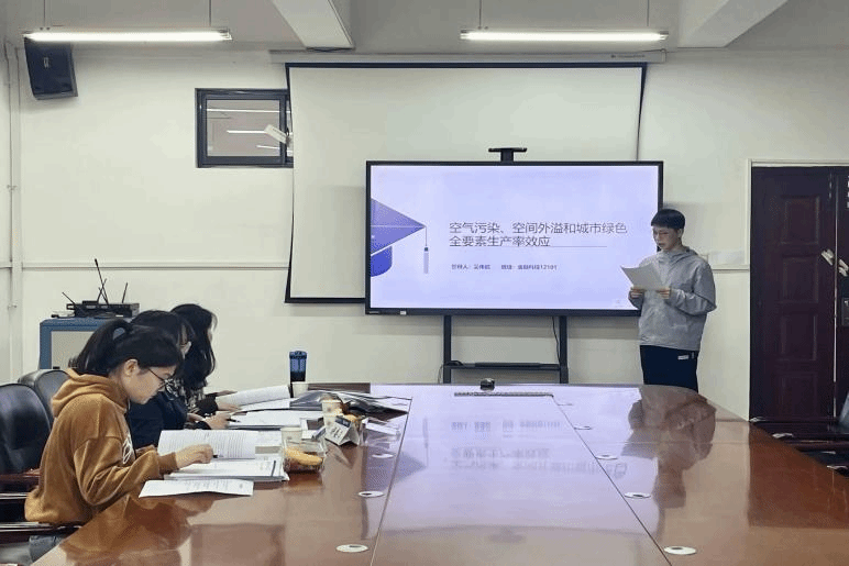 金融科技12101班吴伟航以《空气污染、空间外溢和城市绿色全要素生产率效应》为题,基于实现城市经济发展与资源环境保护“双赢”的目的,利用SDM、CRS乘数等模型,从空间外溢效应方面评估空气污染对城市绿色全要素生产率的影响效应,同时,针对对城市异质性分析,团队也为不同地区的环境治理政策提供针对性建议。
