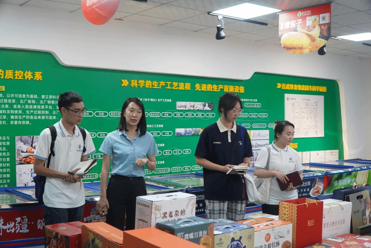 百成鲜食供应链有限公司则是通过集约化管理和工业标准化,打造“双厨房”模式。园区内涵盖有鲜食工厂、仓储物流、供应链体系等多业态形式。通过一站式集采平台,实现链农链商、集采集配的“反向订单式”生产。“‘滚食网’是百成鲜食集团重点打造的餐饮食材一站式集采服务平台,依托集团强大的中央工厂、物流配送优势,为疆内企事业单位、公司、部队、餐饮酒店、社区商超等提供优质的服务。”负责人张美玲向实践队介绍道。面对物流难题,企业通过在全国打造仓储物流配送基地,利用云计算和大数据优化仓储资源,结合线上数字化及智能化管理方式,实现仓储配送无缝衔接。
