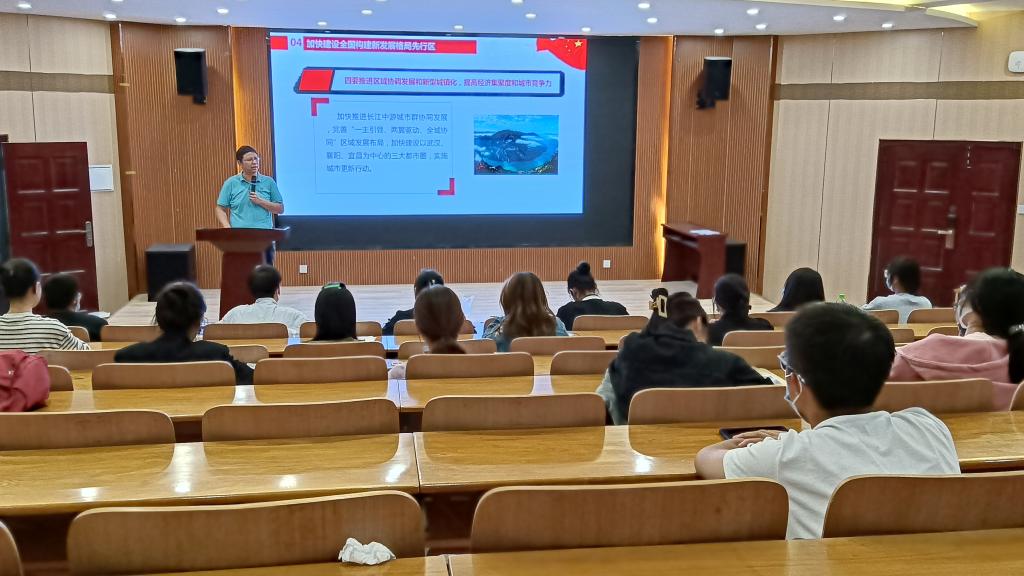 刘园美介绍了省第十二次党代会的召开背景、大会主题,从五个方面具体解读了党代会的报告文本。他简要介绍了过去五年湖北省经济社会发展取得的七大成就,深入分析了新发展阶段湖北面临的新形势新任务,从六个维度、五个方面深刻剖析了新发展理念的内涵特征及今后五年湖北发展提出的工作要求,并围绕省委提出的九大目标举措具体解读了湖北省建设全国构建新发展格局先行区的路径。他基于高校、青年与公司、员工这一现实角色,围绕科教、人才、创新等主题,结合考研就业、创新创业等话题,引导大家思考“经济学子如何在大格局中找准自己的小方位?”这一问题。他勉励大家,要把自己的青春梦想融入湖北省建设全国构建新发展格局先行区大事业中,把聪明才智挥洒在青春奋斗的征程中,不负时代,不负韶华。